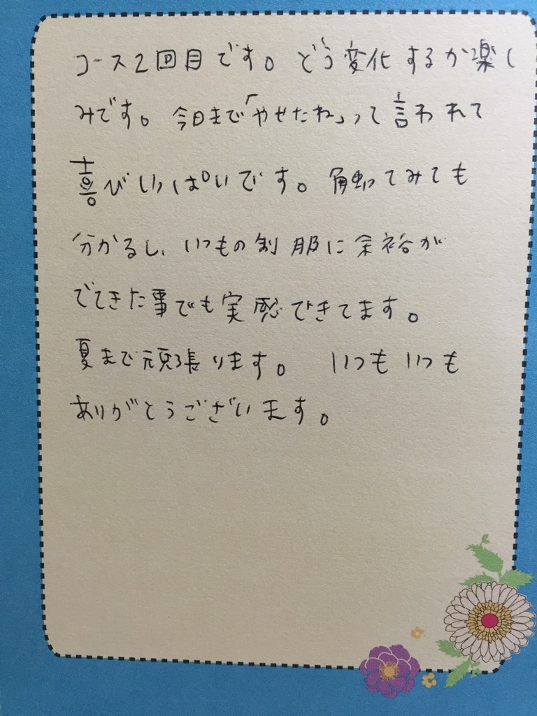 ![]() コー ス2回目です。 どう変化するか楽しみです。 今日まで「やせたね」って言われて喜びいっぱいです。 触ってみても分かるし、いつもの制服に余裕が でてきた事でも実感できてます。 夏まで頑張ります。いつもいつも ありがとうございます。 ■富山県 40代女性 Mさま |
