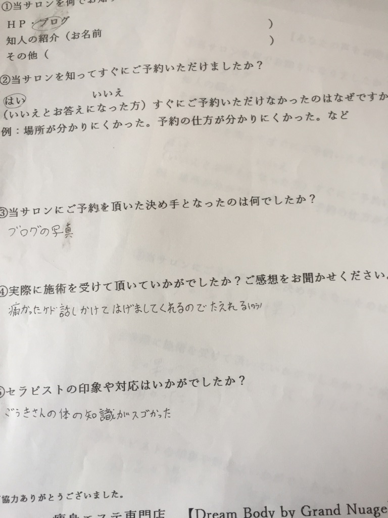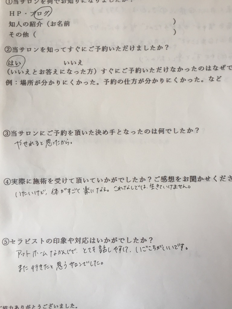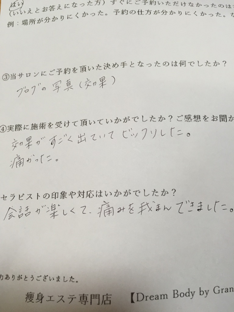 ![]() B当サロンにご予約を頂いた決め手となったのは何でしたか? ブログの写真(効果) C実際に施術を受けて頂いていかがでしたか?ご感想をお聞かせくださ い。 効果がすごく出ていてビックリした。 痛かった Dセラピストの印象や対応はいかがでしたか? 会話が楽しくて、痛み を我まんできました。 ■40代女性 Yさま |