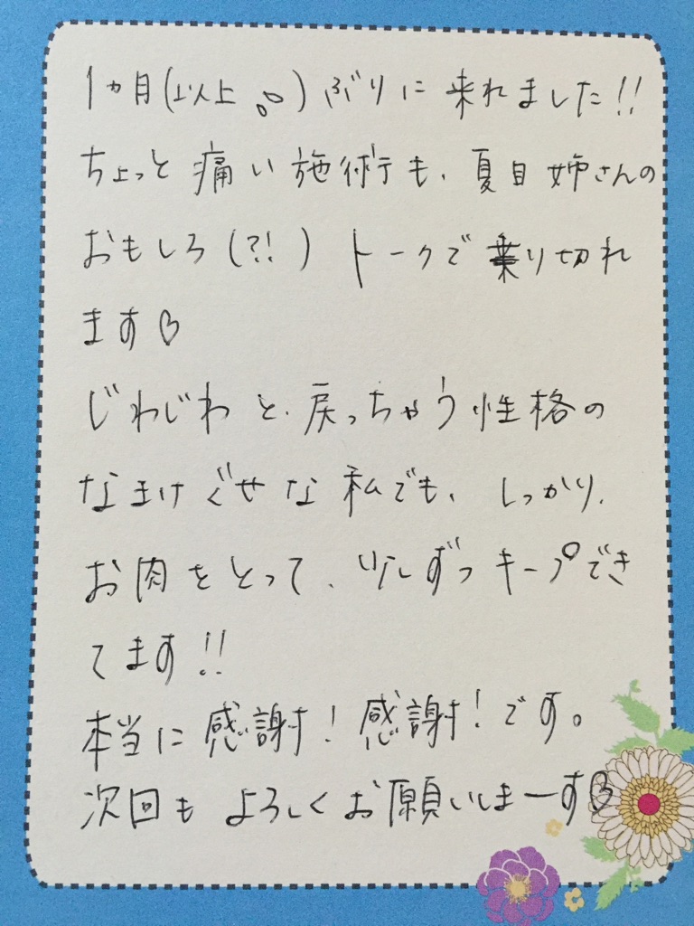 ![]() 1か月(以上)ぶりに来れました!! ちょっと痛い施術も、夏目姉さんの おもしろ!?トークで乗り切れます♡ じわじわと、戻っちゃう性格のなまけぐせな私でも、 しっかり、お肉をとって、少しずつキープできてます!! 本当に感謝!感謝!です。 次回もよろしくお願いしまーす♡ ■知多市 30代女性 Sさま |