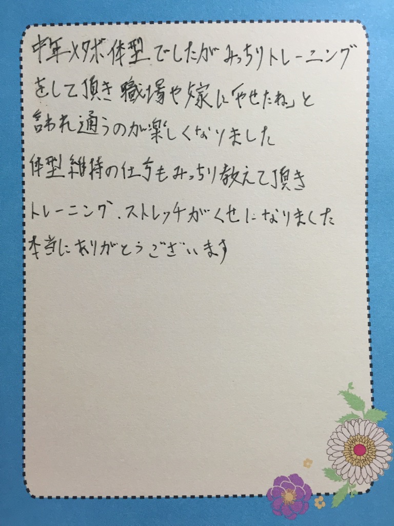 ![]() 中年メタボ体型でしたがみっちりトレーニング をして頂き職場や嫁に「やせたね」と 言われ通うのが楽しくなりました 体型維持の仕方もみっちり教えて頂き トレーニング、ストレッチがくせになりました 本当にありがとうございます 声掛けで頑張れました。 本当にありがとうございました。 ■常滑市 30代男性 Gさま |