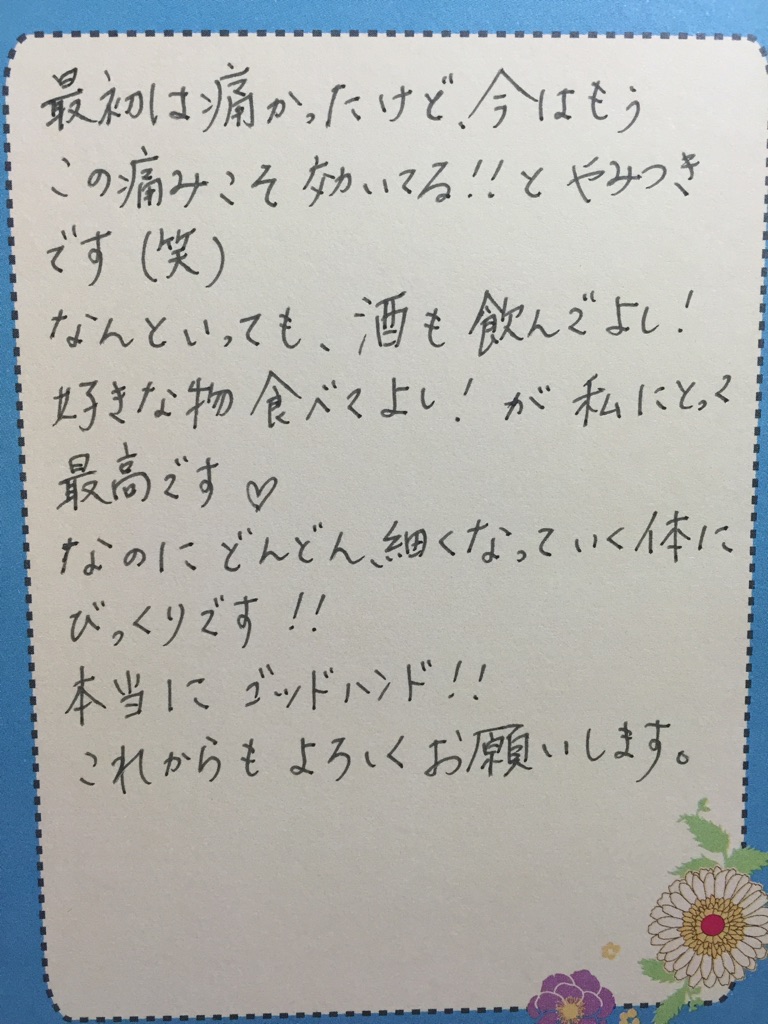 ![]() 最初は痛かったけど、今はもう この痛みこそ効いてる!!とやみつきです(笑) なんといっても、酒も飲んでよし! 好きなもの食べてよし!が私にとって最高です♡ なのにどんどん細くなっていく体に びっくりです!! 本当にゴットハンド!! これからもよろしくお願いします。 ■一宮市 20代女性 Oさま |