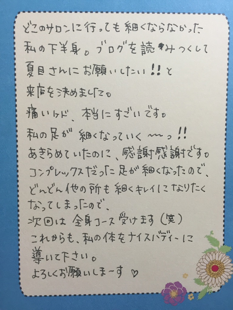 ![]() どこのサロンにいっても細くならなかった 私の下半身。ブログを読みつくして 夏目さんにお願いしたい!!と 来店を決めました。 痛いけど、本当にすごいです。 私の足が細くなっていく〜〜っ!! あきらめていたのに、感謝感謝です。 コンプレックスだった足が細くなったので、 どんどん他の所も細くキレイになりたく なってしまったので、 次回は全身コース受けます(笑) これからも、私の体をナイスバディーに 導いて下さい。 よろしくお願いしまーす♡ ■西尾市 20代女性 Kさま |
