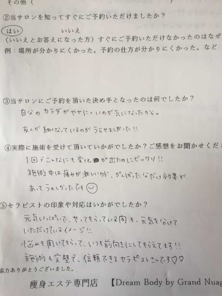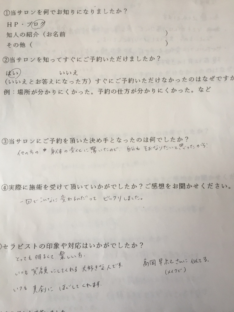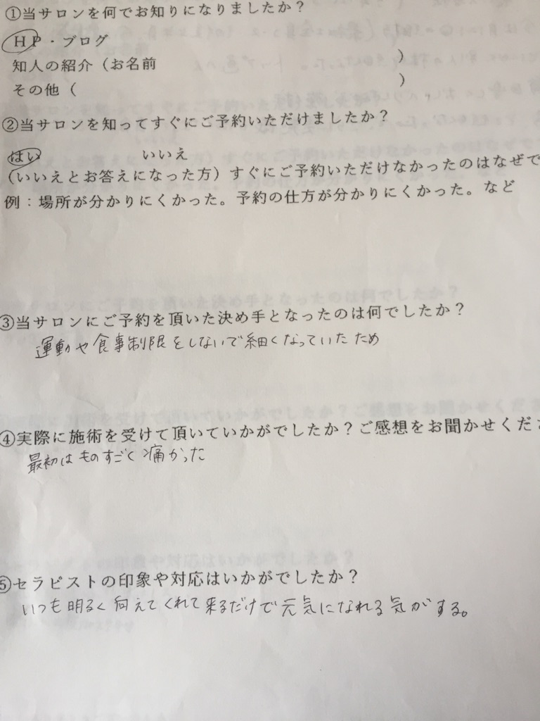 ![]() B当サロンにご予約を頂いた決め手となったのは何でしたか? やせれるとおもったか ら C実際に施術を受けて頂いていかがでしたか?ご感想をお聞かせくださ い。 いたいけど、体がすご く楽になる。これなしでは生きていけません。 Dセラピストの印象や対応はいかがでしたか? アットホームなかんじ で、とても話しやすくて、いごこちがいいです。 また行きたいと思うサ ロンでした。 ■20代女性 M様 |