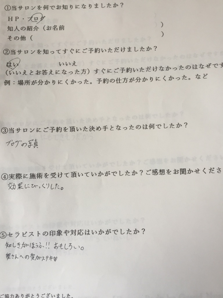 ![]() B当サロンにご予約を頂いた決め手となったのは何でしたか? ブログの写真 C実際に施術を受けて頂いていかがでしたか?ご感想をお聞かせくださ い。 効果にびっくりした Dセラピストの印象や対応はいかがでしたか? 知しきがほうふ!!お もしろい 奥さんへの愛がステキ ■20代女性 Kさま |